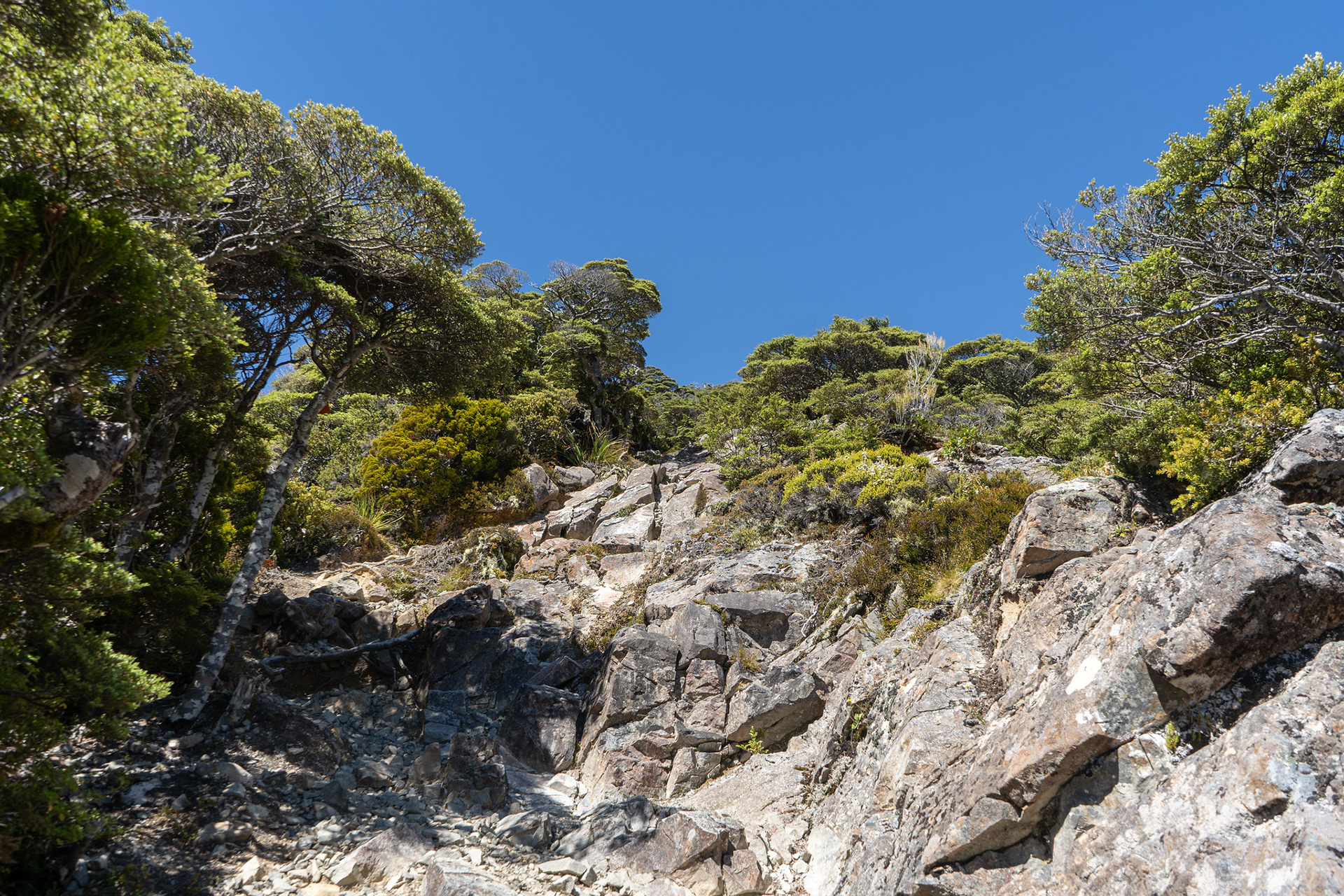 The final approach to the summit ridge, the trackline visible centre right sneaking between the cliff bands.