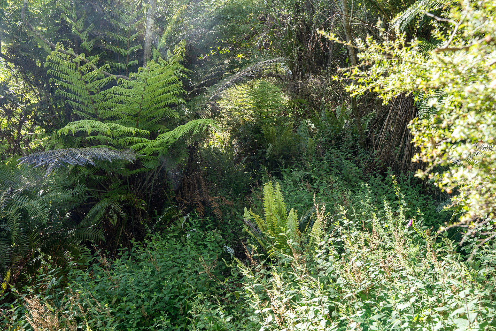Continuing along the ridge soon brings you to the true summit of the peak, though there is little beyond a logbook to mark it. The high point is not pronounced and there are no views beyond the adjacent forest, so it's one to simply tick off before dropping NW back towards the road. There are sporadic views off the descent spur across to Cullen Point and the lower Pelorus River.