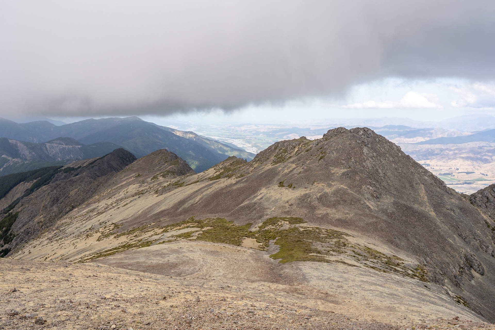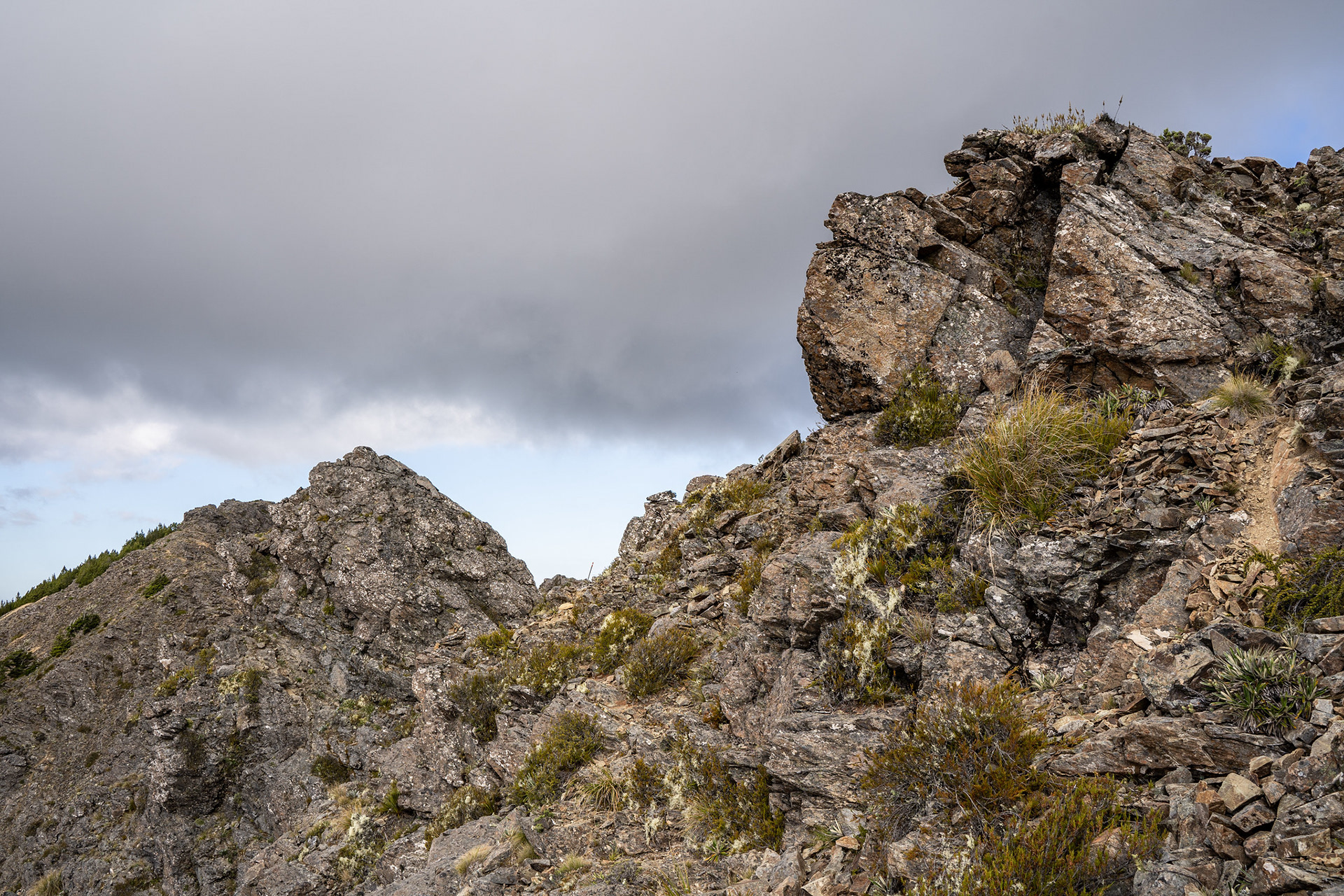 After a kilometre, the route drops right and onto face slopes. It's not super pleasant travel, to be honest - the terrain is largely loose slips and scratchy vegetation, but it's comfortably followable and not too difficult. It's also mercifully short, quickly giving way broad rockfields which soon lead to the summit.
