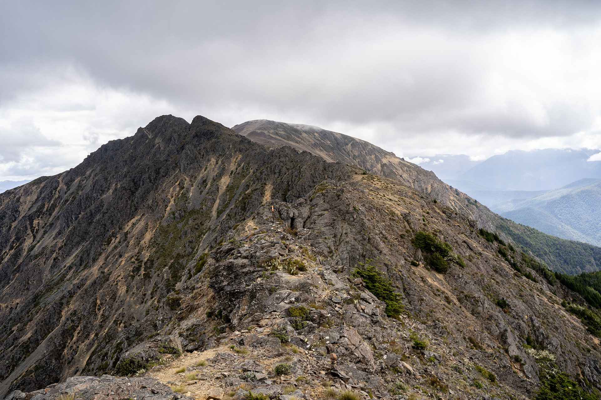 The first hundred metres or so is a bit vague, but if you head in the general direction of the pines you'll find a marked route that cuts a narrowish swathe through the foliage. It doesn't last long before it spits you up onto the range crest, which is where the fun begins.