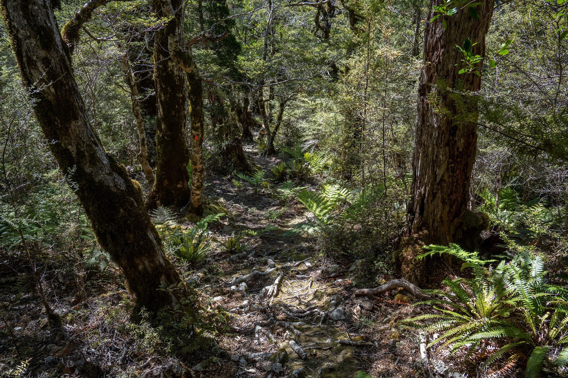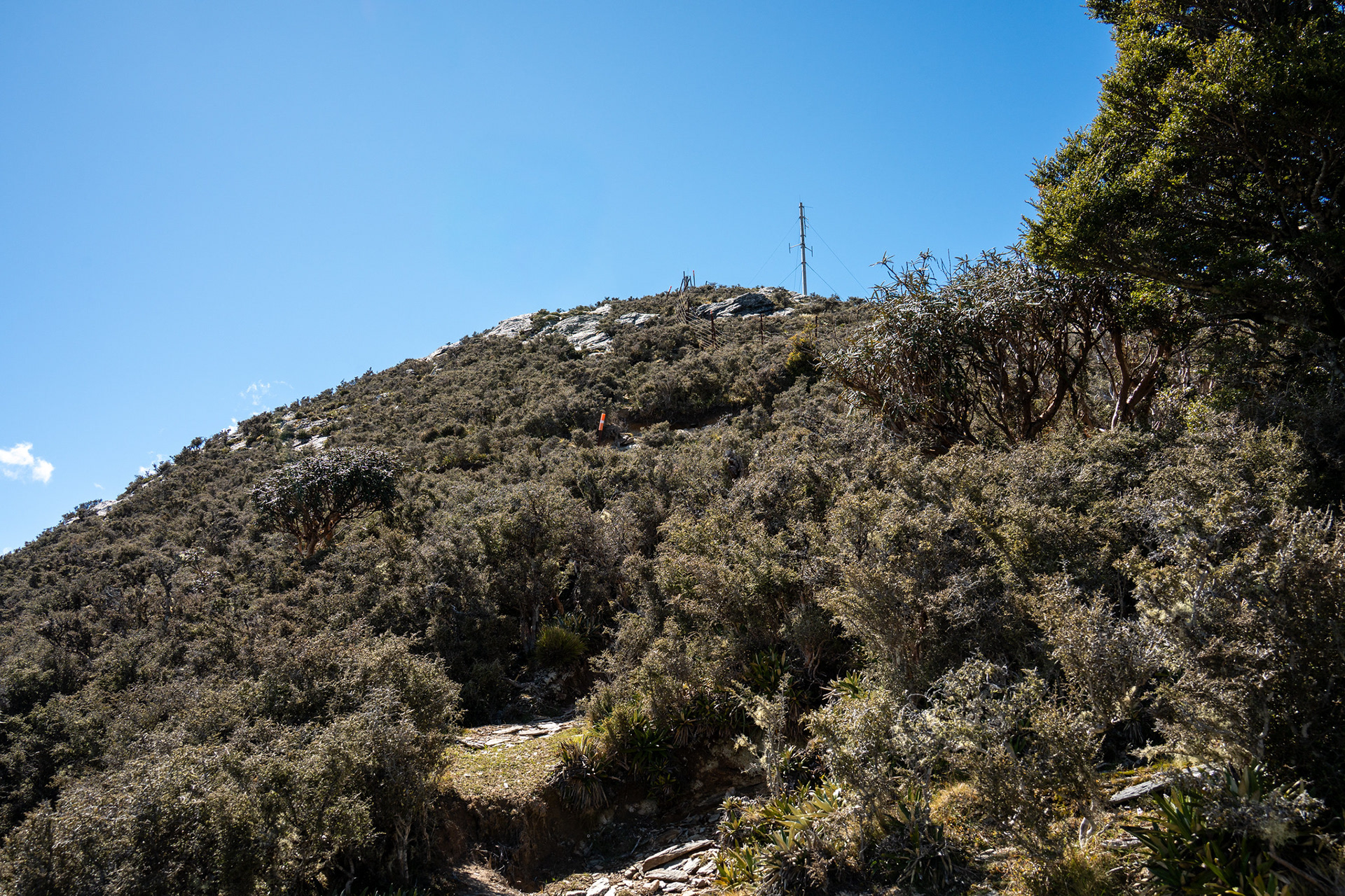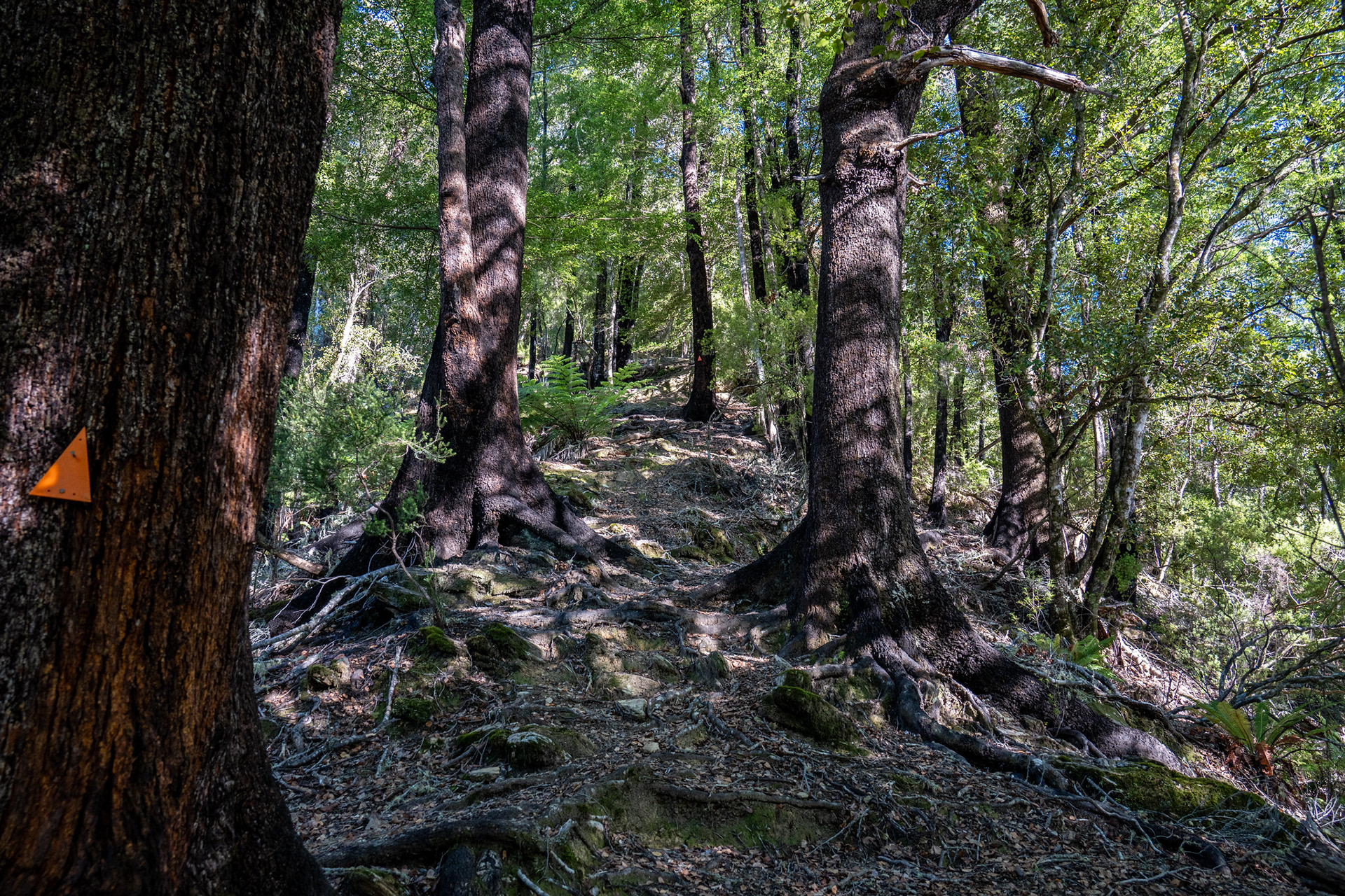 About 250m in, the track junction is reached and you have the option of going left (Sunday) or right (Riley). The options are much of a muchness, though most people go left. Going clockwise gets the steeper travel out of the way early, and the somewhat muddled initial climbing on a mixture of face sidles and vague spurs is probably easier to follow on the way up. Going anti-clockwise allows for more gentle climbing, and also makes for easier navigation on the approach to Riley which is a bit vague in reverse. The vegetation is a bit nicer on the Riley side, if that is a consideration for you.