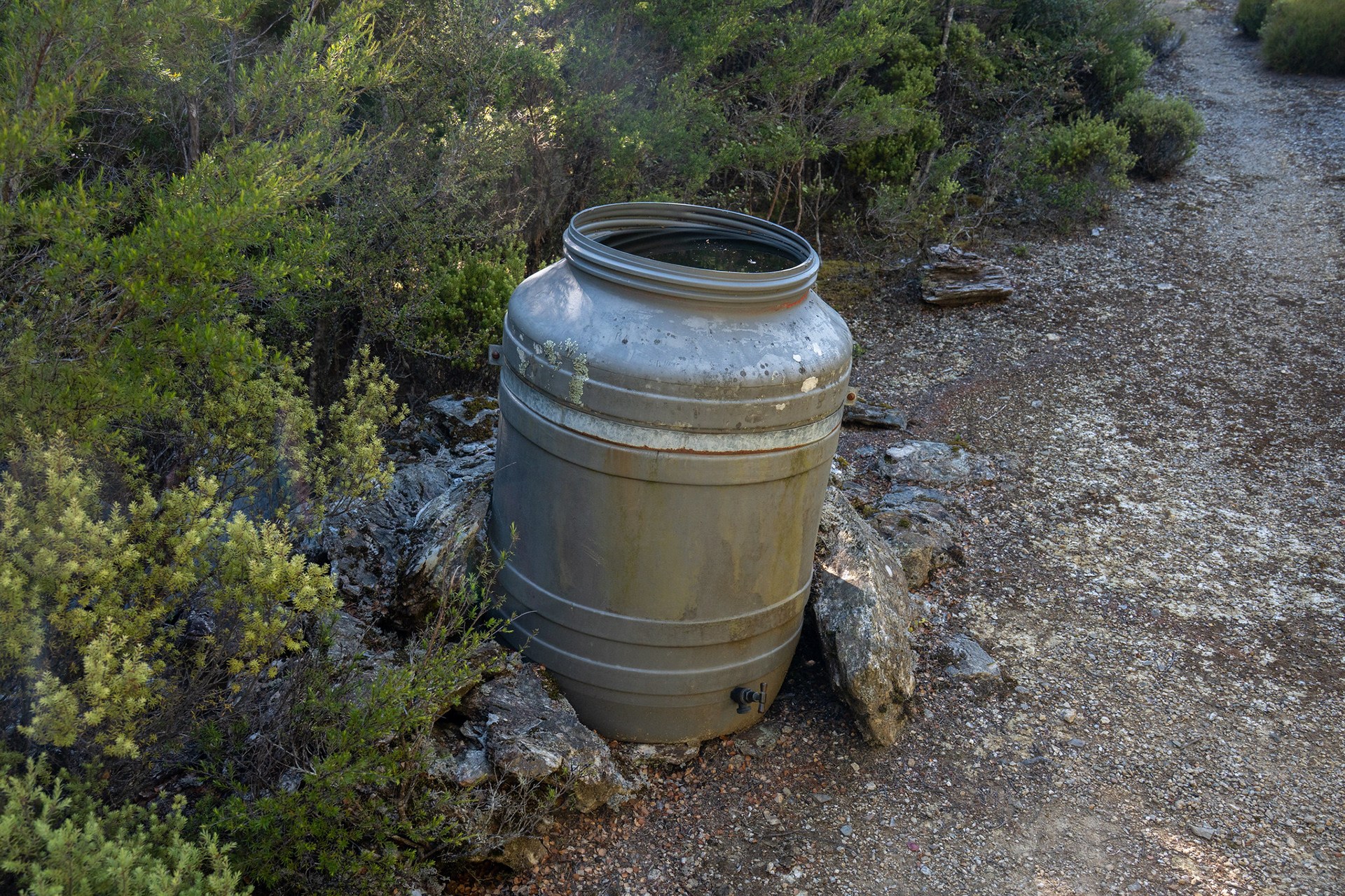 Heading left, the track immediately kicks into a mixture of sidles and punchy climbs. It's reasonably easy to follow throughout, and soon hits the main spur crest at about 600m. The topo shows a private 4WD track intersecting at this point, though nothing is visible in the field. It does mark a transition to more gentle climbing though, ticking off the metres until a water barrel is reached at around 820m. If you don't mind drinking somewhat stagnant rainwater, this would facilitate an easy trail run of the loop with an extra water topup at the biv.